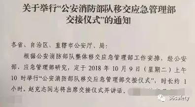 據(jù)多家媒體披露,根據(jù)公安消防部隊(duì)整體移交應(yīng)急管理部工作安排,經(jīng)應(yīng)急管理部、公安部部門(mén)研究,定于2018年10月9日(周二)上午10時(shí)舉行“公安消防部隊(duì)移交應(yīng)急管理部交接儀式”,時(shí)長(zhǎng)約1小時(shí),公安部部長(zhǎng)趙克志將出席交接儀式并講話,主會(huì)場(chǎng)設(shè)在公安部機(jī)關(guān)樓。