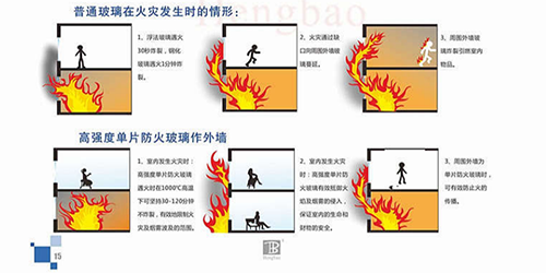 普通浮法玻璃遇火30秒炸裂,鋼化玻璃遇火1分鐘炸裂,不具備耐火完整性無法在一定時(shí)間內(nèi)阻擋火勢蔓延。而單片防火玻璃,遇火時(shí)在1000℃高溫下可堅(jiān)持30—120分鐘不炸裂,有效地限制火災(zāi)以及煙霧波及的范圍。